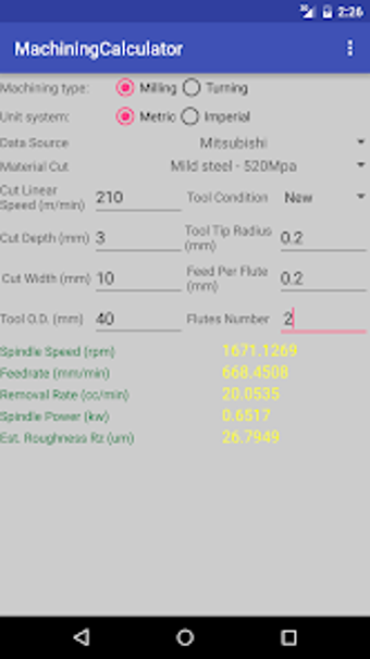 Machining Calculator é uma ferramenta útil para profissionais da usinagem, disponível para dispositivos Android. Este aplicativo fornece cálculos rápidos e precisos para operações de fresagem e torneamento, permitindo que os usuários determinem a velocidade do eixo, a taxa de alimentação, a taxa de remoção de cavacos, a potência do eixo necessária e a rugosidade superficial estimada. Com base nas ferramentas, materiais de trabalho e condições de corte, o aplicativo facilita a execução de tarefas complexas de usinagem.